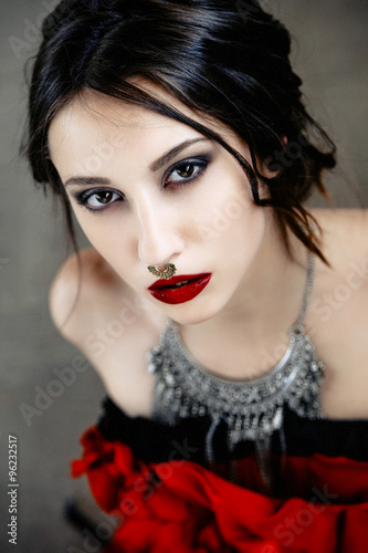 Beautiful woman with cute face bright make up red lips and piercing on nose