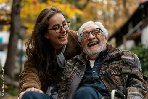 Beautiful woman with eyeglasses pushing her disabled father on wheelchair, both smiling and laughing together.