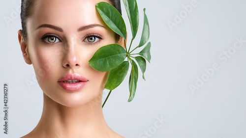 Beautiful woman with green leave near face and body. Closeup girl's face with green leave. Skin care beauty treatments concept.