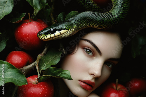Beautiful woman with green snake and red apples representing Eve in the Garden of Eden