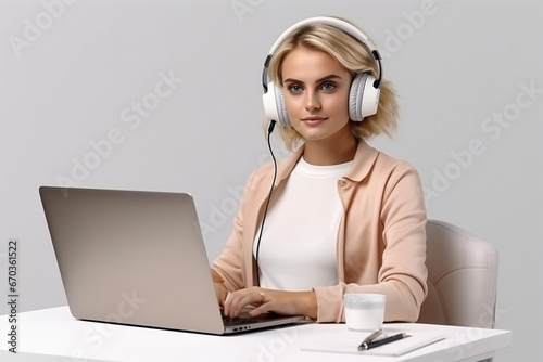 one person, photo, technology, adult, woman, laptop, color image, business, computer, horizontal, young adult, communication, female, wireless technology, indoor, working, businesswoman, cheerful, missy, cyberspace, ai, earphones, beauty, headset, listening, occupation, beautiful woman, lifestyle, phone, businessperson, portrait, service, casual clothes, confidence, relaxation, talking, cute, connection