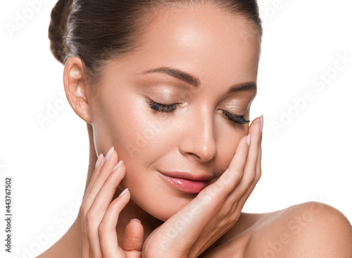 Beautiful woman with healthy clean fresh skin hand touching face manicure beauty isolated on white