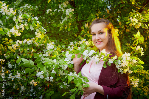 Beautiful woman with long hair walking in the park with blooming apple trees