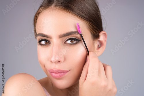 Beautiful woman with perfect shape eyebrows. Womans brows close up. Beautiful girl with eyebrow brush. Eyebrow correction. Long eyelashes and thick eyebrows.