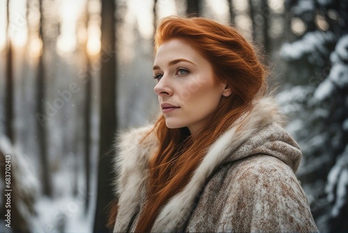 Beautiful Woman with red hair in the winter forest with winter coat in the autumn forest. Winter Snowy Atmosphere. Generative AI