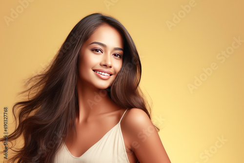 young, indian, asian, woman, female, pretty, wellness, closeup, hair care, luxury, shampoo, keratin, shine, luxurious, hairdresser, cosmetic, cosmetic, profile, haircut, person, clean, smooth, style, make-up, straight, sensuality, shiny, portrait, honed, beautiful, colouring, model, care, salon, bright, hair, fashion, face, healthy, health, brunette, long, skin, background, coiffure, glamour, girl, beauty, ai