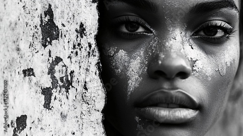 face, woman, beauty, portrait, black, white, contrast, textured, skin, eye, lip, nose, expression, aesthetic, monochrome, closeup, detail, elegant, delicate, subtile, natural, light, shadow, structure, form, smooth, surface, abstract, art, style, design, composition, visual, graphic, pattern, organic, material, rough, cracked, debris, dirt, paint, layer, peel, aged, gritty