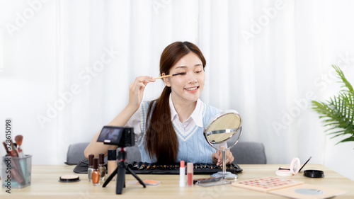 Beautiful women with social media influences are teaching makeup and use cosmetics, In front of the camera to recording vlog video live streaming, Online business on concept of beauty bloggers.