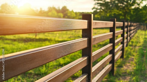 Beautiful wooden fence in a serene rural landscape at sunset with soft sunlight shining through trees