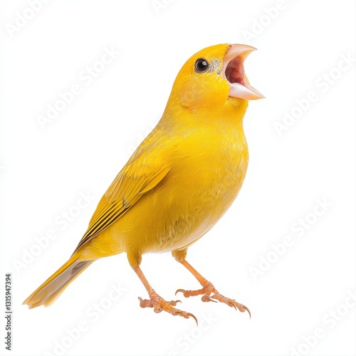 Beautiful yellow canary bird singing gracefully with open beak captured against a bright white background
