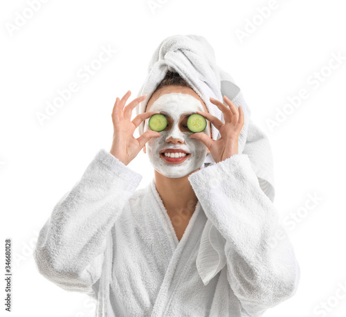 Beautiful young African-American woman with cucumber slices and facial mask on white background