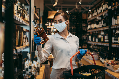Beautiful young and elegant woman with face protective mask and gloves buying healthy food and drink in a modern supermarket or grocery store. Pandemic or epidemic lifestyle and consumerism concept.