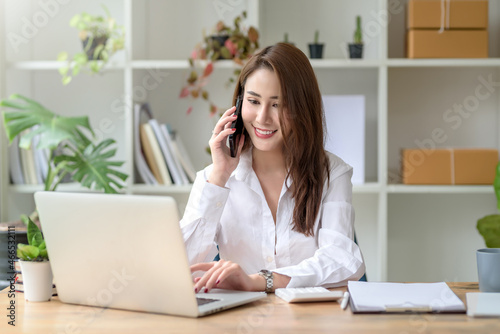 Beautiful young Asian businesswoman charming smiling and talking on the mobile phone in the office.