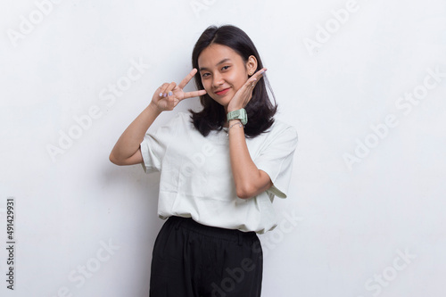 peace, girl, portrait, signs, asian, young, beautiful, victory, success, female, hand, gesture, background, happy, white, finger, person, smile, showing, isolated, woman, pretty, people, casual attire, v, cheerful, attractive, chinese, thai, studio, 2, japanese, joyful, copy space, 2, southeast asia, 20s, succeed, advertising, asia, cute, winner, positive, symbol, teenage, indonesian, indonesia, 1, gesticulate