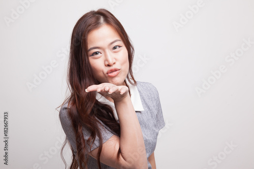 blow, blowing, female, girl, grey, hand, kiss, kissing, lady, lip, mouth, person, studio, woman, young
