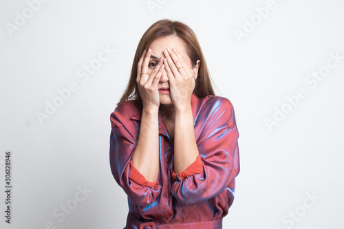 beautiful, eye, female, finger, hide, lady, look, peeking, person, portrait, secret, see, white, woman, young, red