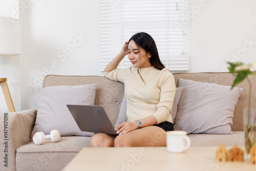Beautiful Young Asian woman using laptop computer on sofa at home, shopping online with internet in happy mood and Relax part time concept