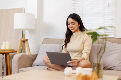 Beautiful Young Asian woman using laptop computer on sofa at home, shopping online with internet in happy mood and Relax part time concept