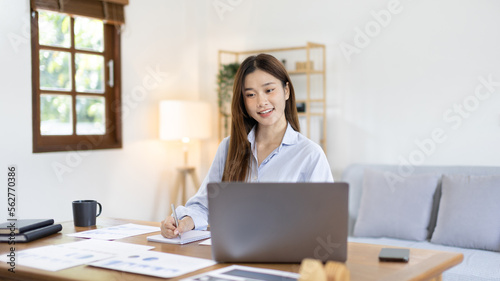 Beautiful young asian woman watching live video or video call of teacher teaching on laptop in her home, Take notes of important conversations and messages during the teacher's teaching.