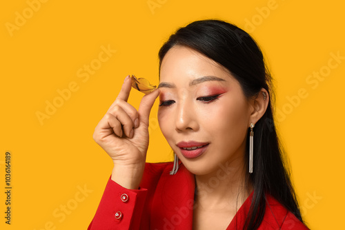 Beautiful young Asian woman with boat on yellow background. Chinese New Year celebration