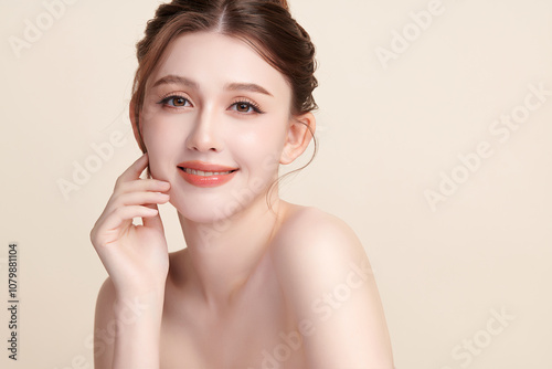 Beautiful young asian woman with clean fresh skin on beige background, Face care, Facial treatment, Cosmetology, beauty and spa, Asian women portrait.