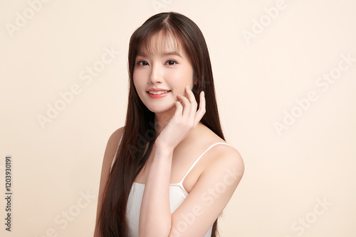 Beautiful young asian woman with clean fresh skin on beige background, Face care, Facial treatment, Cosmetology, beauty and spa, Asian women portrait.