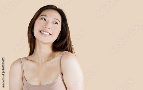 Beautiful young Asian woman with clean fresh skin on beige background, face care, facial treatment, cosmetology, beauty and spa, Asian women portrait.