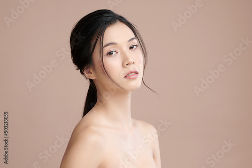 Beautiful young asian woman with clean fresh skin on beige background, Face care, Facial treatment, Cosmetology, beauty and spa, Asian women portrait.
