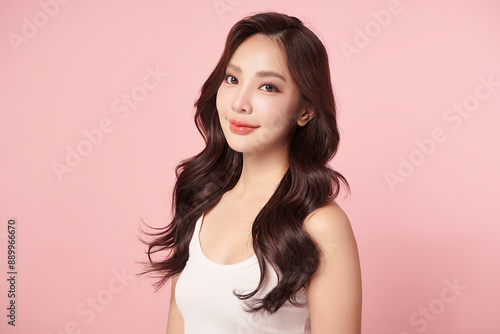 Beautiful young asian woman with clean fresh skin on pink background, Face care, Facial treatment, Cosmetology, beauty and spa, Asian women portrait.