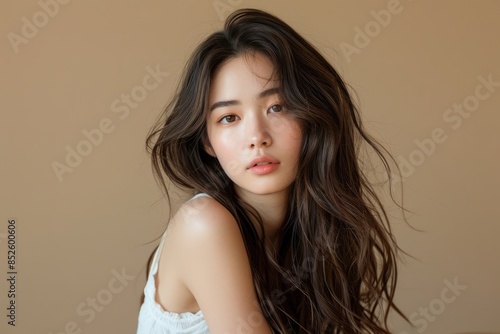 Beautiful young Asian woman with clean, fresh skin touching her face and smiling on a white background, isolated in a beauty treatment concept, spa luxury aesthetic.
