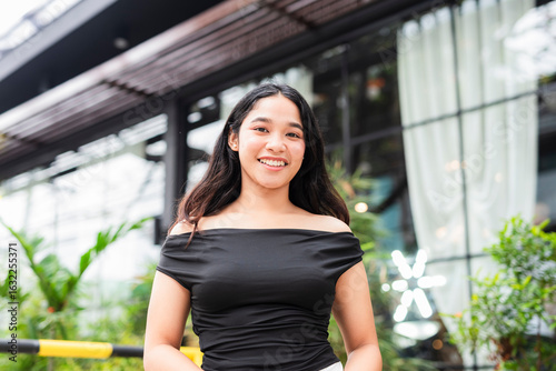 Beautiful young Asian woman with off-shoulder black top smiling brightly at camera, standing outside a modern cafe setting.
