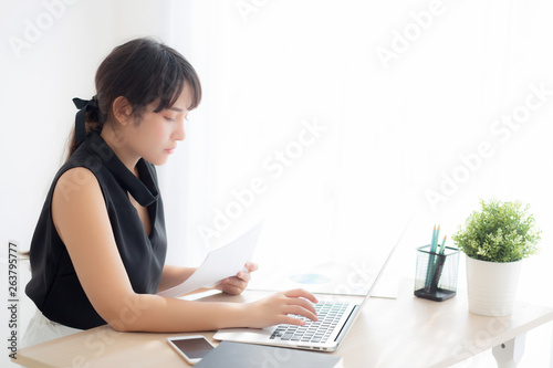 Beautiful young asian woman working and typing laptop computer at office, businesswoman looking graph diagram analysis statistic data of finance, girl using notebook, profit growth, business concept.