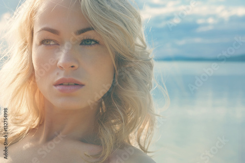 Beautiful young blond woman outdoors portrait near the lake
