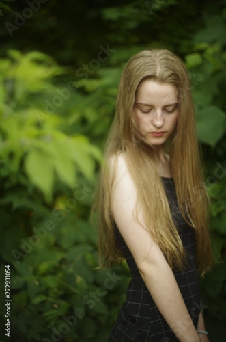 beautiful young blonde with long flowing hair on a blurry background