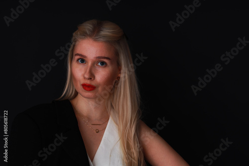 studio, blue eye, fashionable, feminine, coiffure, style, casual attire, woman, blond, young, cute, beautiful, model, female, attractive, girl, clothes, person, fashion, make-up, beauty, caucasian, blond, red, hair, white, pretty, sexy, black, jacket, glamour, people, leather, lifestyle, face, lip, gorgeous, lady, portrait, black jacket, blonde woman