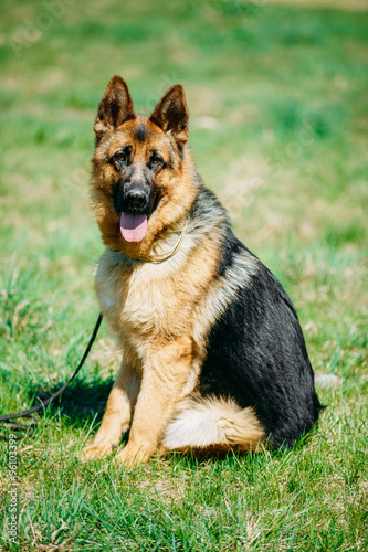Beautiful Young Brown German Shepherd Dog Sitting In Green Grass