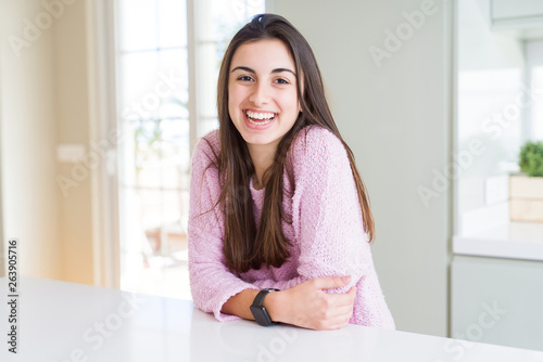 Beautiful young brunette woman smiling cheerful looking at the camera with a big smile on face showing teeth