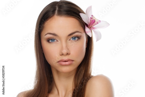 adult, attractive, background, beautiful, beauty, blue, brown, brunette, care, caucasian, closeup, cosmetic, elegance, emotion, eye, face, fashion, female, flower, fragile, girl, glamour, hair, coiffure, coiffure, isolated, lip, long, constructed, make-up, make-up, model, 1, orchid, people, person, portrait, pose, posing, positive, pretty, sexy, studio, style, vogue, white, woman, young