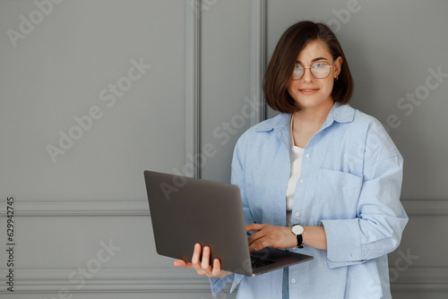 Beautiful young businesswoman with glasses on her eyes is wearing a white t-shirt and a blue shirt is holding her laptop in her hands on a grey blackground