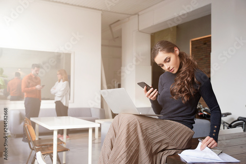 business, businesswoman, woman, woman, mobile phone, handy, mobile phone, phone, computer, laptop, notebook, young, working, work, men at work, secretary, office, sitting, desk, assistant, administrator, people, person, attractive, financial, adviser, sale, clerk, looking, 20s, 30s, professional occupation, manager, technology, communication, caucasian, confident, smiling, beautiful