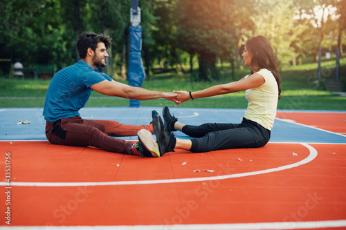 Beautiful young couple enjoying together on basketball court. Bright sunny summer day..