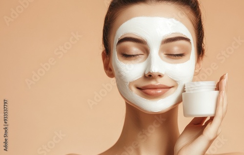Beautiful young European woman wearing facial mask, holding jar or natural cream, posing against beige background, recommending skincare products