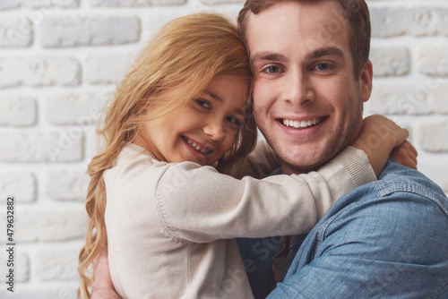 adorable, adult, attractive, background, beautiful, blond, brick, caucasian, cheerful, children, childhood, concept, cute, father, daughter, emotion, family, father, female, fun, girl, happiness, happy, having, home, hugging, indoor, laughing, line, little, looking, love, man, eltern, people, portrait, pretty, human relationships, schoolgirl, smiling, standing, studio, three, together, togetherness, wall, white, young
