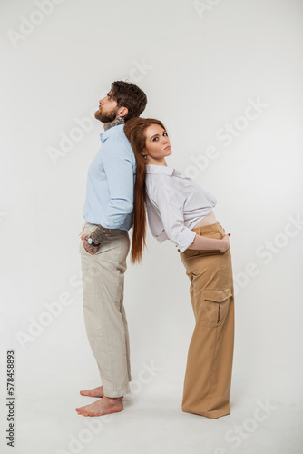 Beautiful young fashionable business couple man and woman in an elegant stylish vintage clothing with shirt and pants standing back to back on a white background