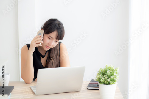 Beautiful young freelance asian woman smiling working on laptop computer and talking mobile smart phone at desk office with professional, girl using notebook, business and lifestyle concept.