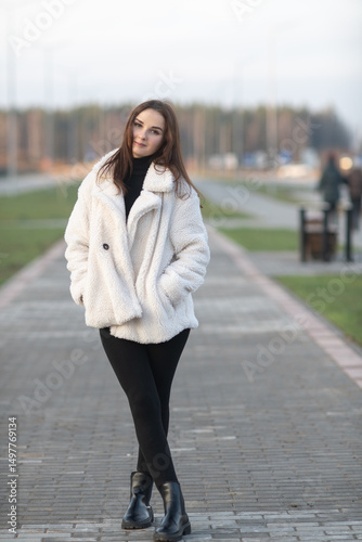 Beautiful young girl with long hair outdoors in winter clothes on a sunny day.