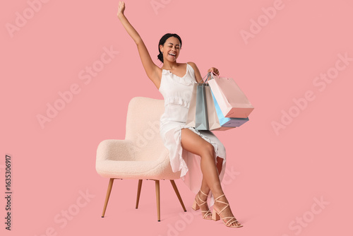 Beautiful young happy African-American woman with shopping bags sitting on armchair against pink background