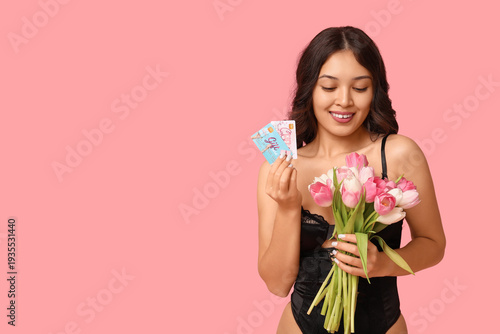 Beautiful young happy Asian woman in sexy lingerie with bouquet of tulips and gift cards on pink background. International Women's Day