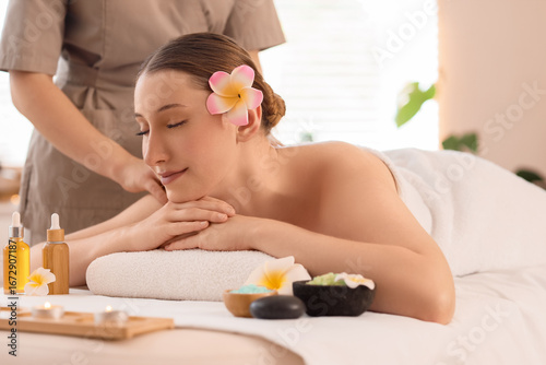 Beautiful young happy woman with pink plumeria flowers and cosmetic oil getting massage on couch in spa salon