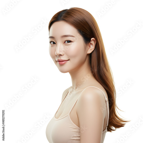 Beautiful Young Korean Woman Portrait, K-Beauty Model with Healthy Glowing Skin, Natural Makeup, Isolated on White Studio Background with Copy Space